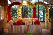 Свадебное оформление: - Драпировка тканью и украшение искусственными цветами. - Декорирование светодиодными подсветками. - Акжол (стойки с букетами цветов и белая дорожка для жениха и невесты).